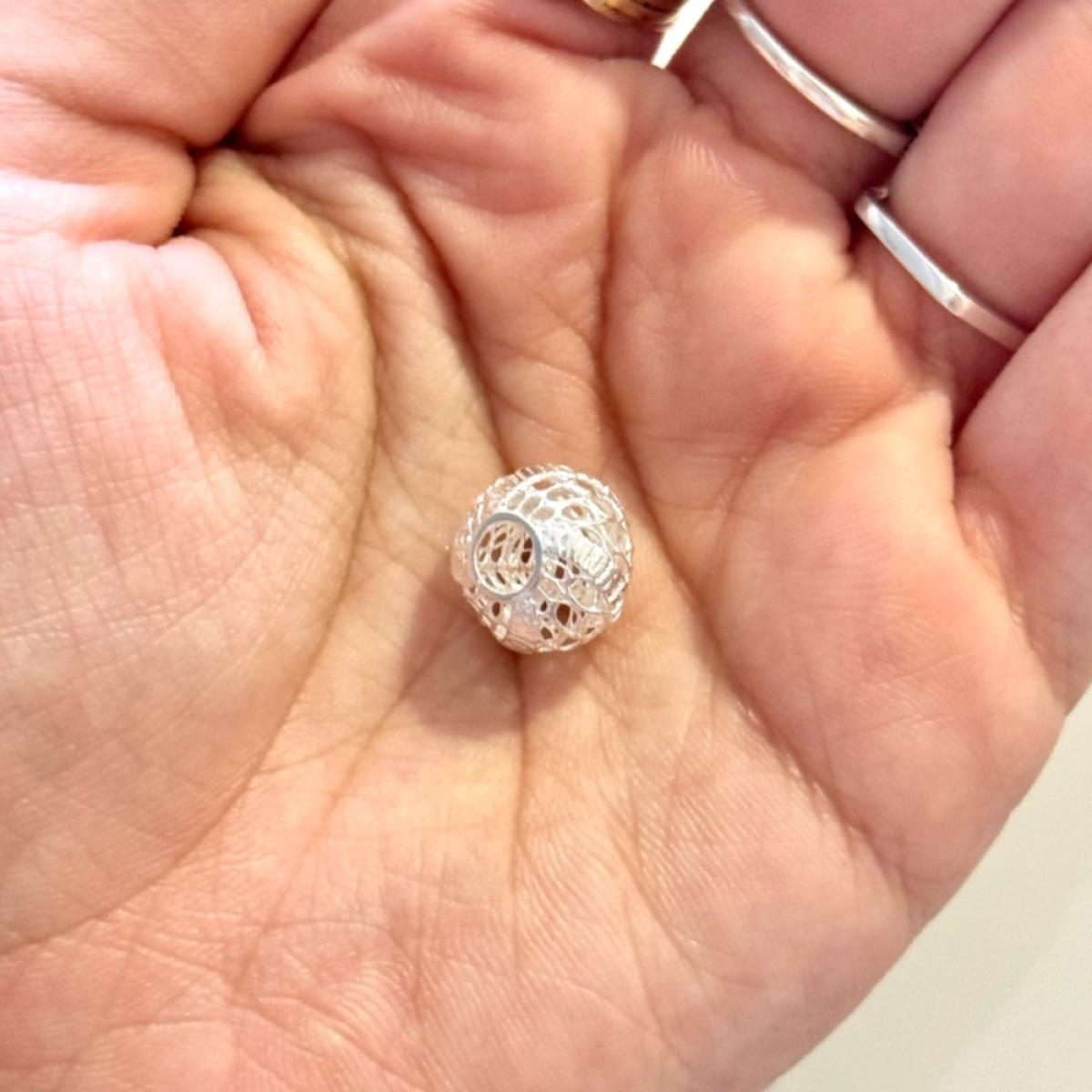 Berloque separador em Prata 925 legítima, com design delicado em trama rendada vazada, que transmite elegância, feminilidade e sofisticação. Uma peça encantadora e versátil, perfeita para organizar berloques na pulseira, acrescentando leveza e requinte à composição.
