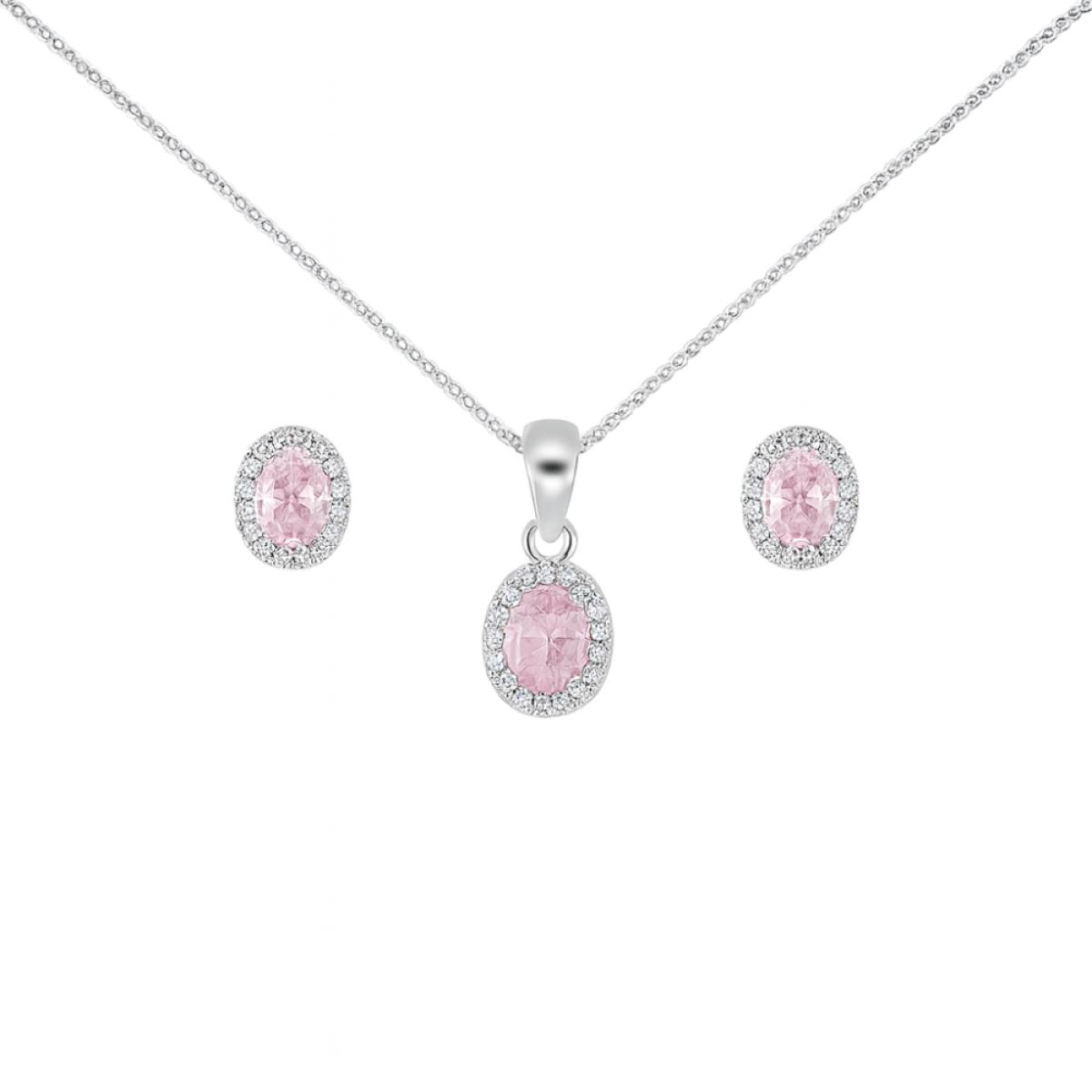 Conjunto em Prata 925 legítima, composto por colar e brincos com pedras de zircônia oval na cor rosa bebê, rodeadas por delicado cravejamento de micro zircônias cristal. O design clássico e sofisticado valoriza a delicadeza da pedra central, trazendo brilho e romantismo à peça. Uma joia perfeita para ocasiões especiais, mas também ideal para dar um toque refinado ao visual do dia a dia.