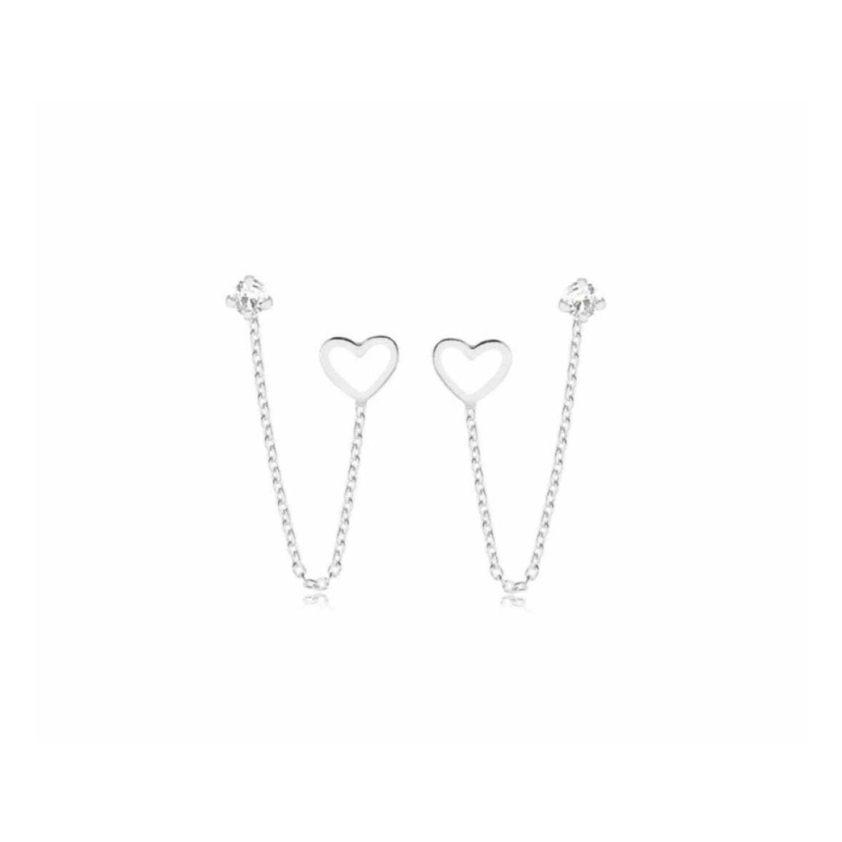 Par de Brincos Coração e Ponto de Luz Corrente em Prata 925